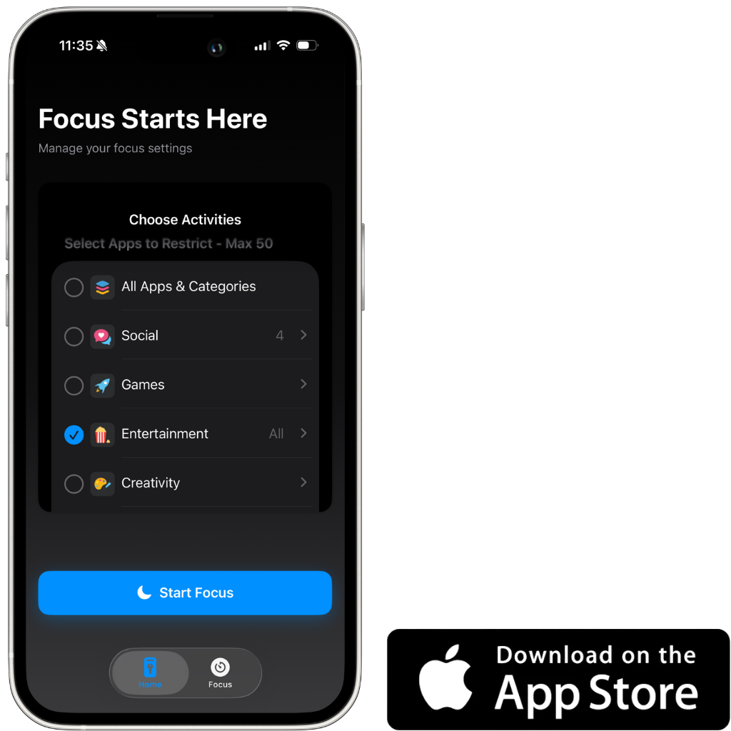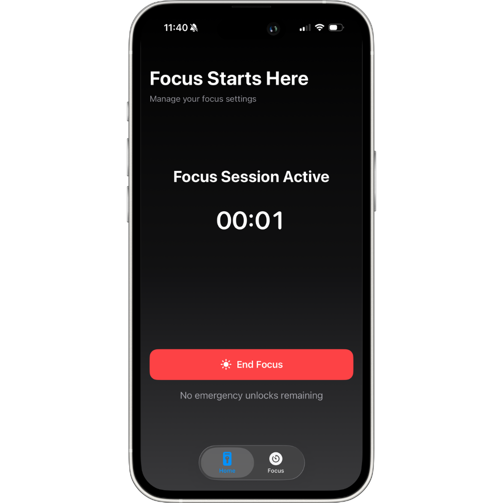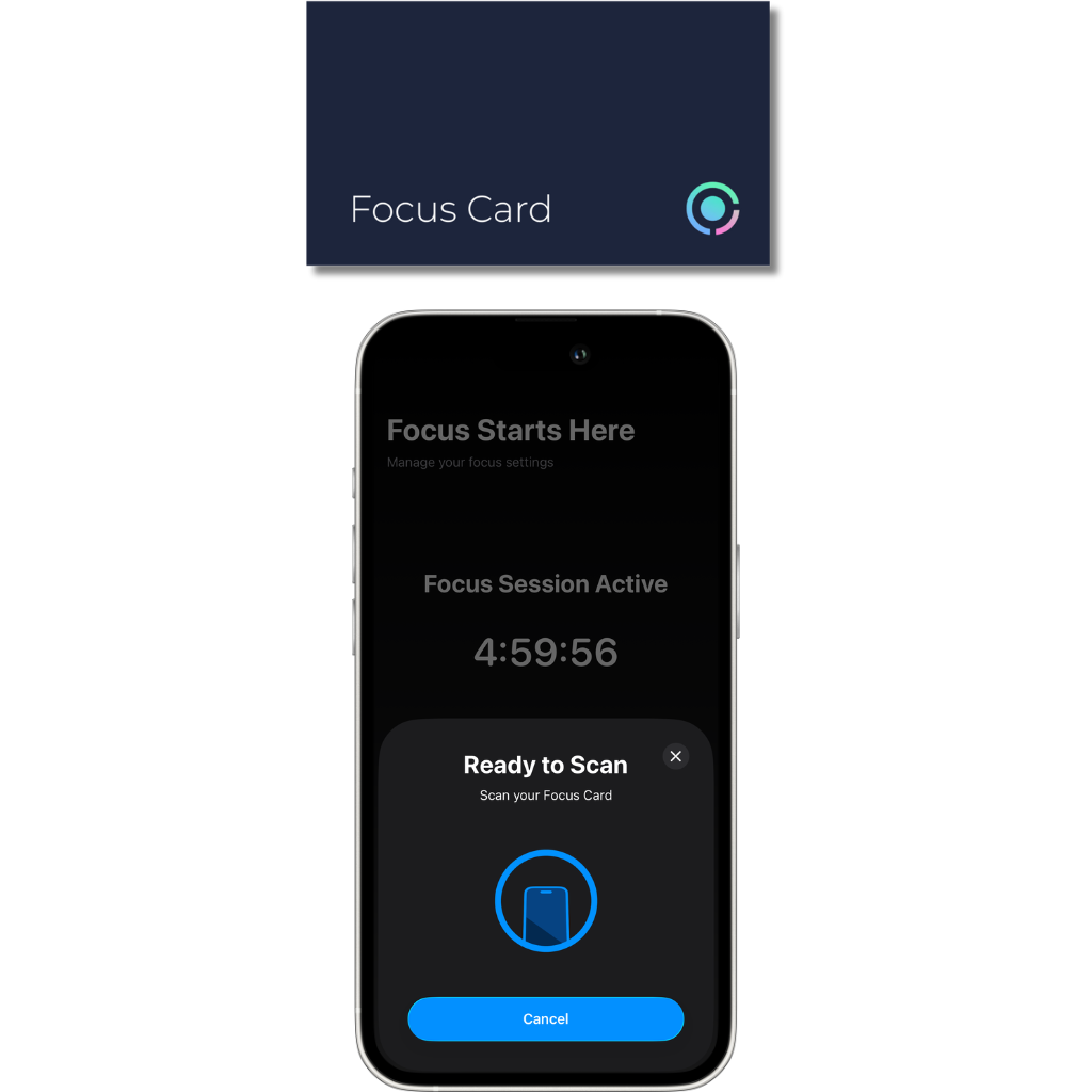 When the time is right, use your Focus Card to unlock your apps. Your time spent in Focus will be logged in the app for your reference.