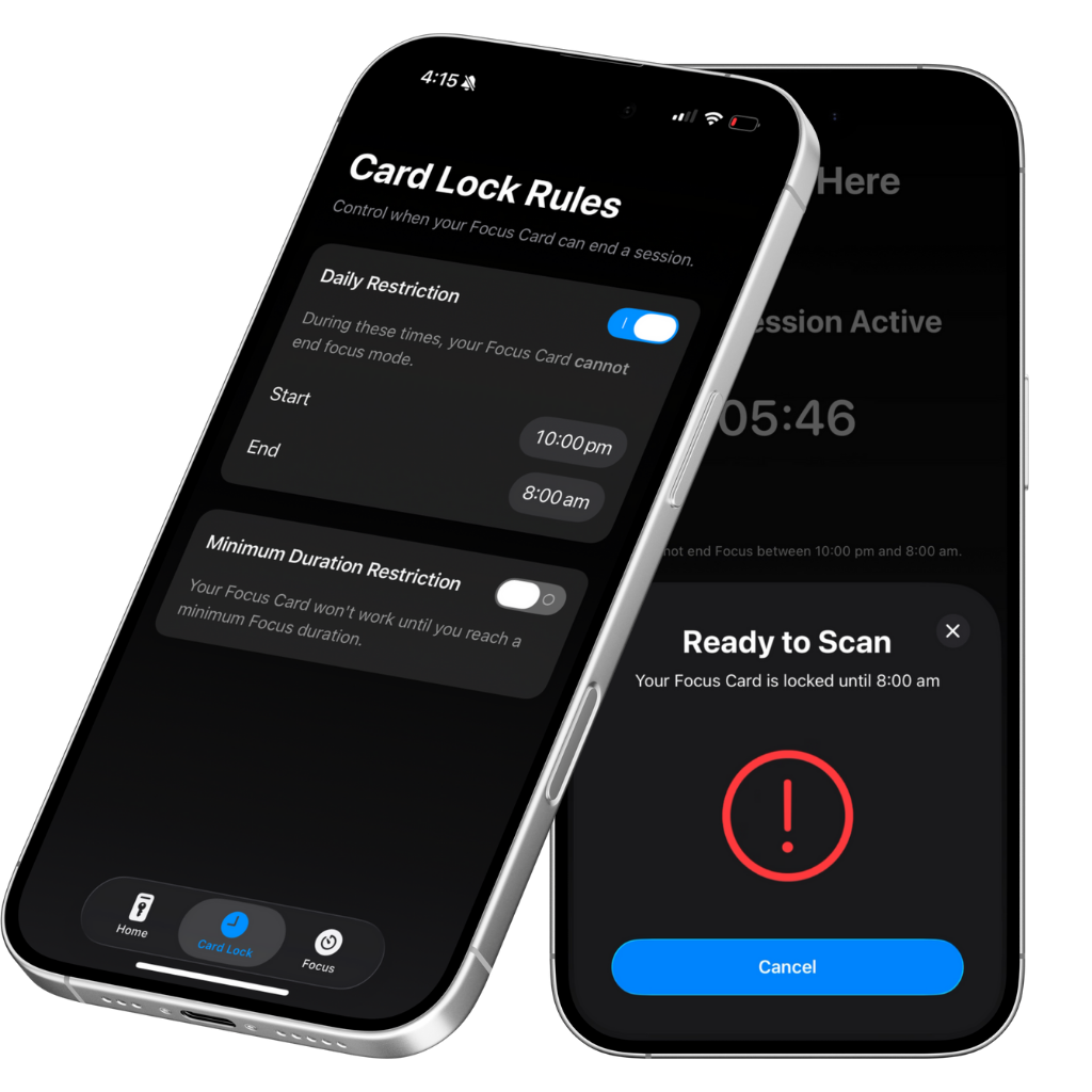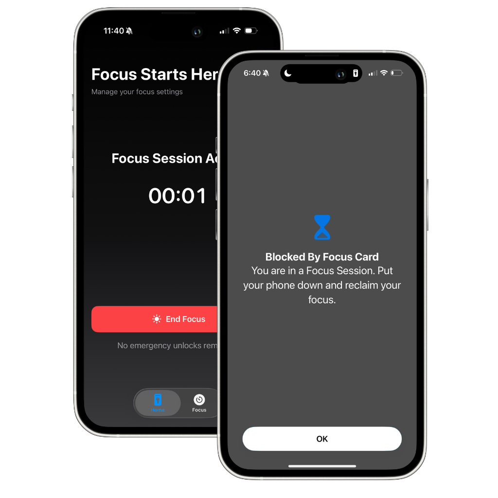 Focus Card is a simple tool designed to help you take control of your screen time. Activate focus mode via the free Focus Card app and instantly block selected apps, giving you the mental space to concentrate or unwind. When you're ready to unblock, simply tap your Focus Card.